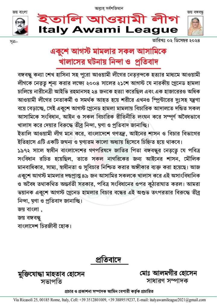 বঙ্গবন্ধু কন্যা শেখ হাসিনা সহ পুরো আওয়ামী লীগের নেতৃবৃন্দকে হত্যার মাধ্যমে আওয়ামী লীগকে নেতৃত্ব শূন্য করার লক্ষ্যে ২০০৪ সালের ২১শে আগস্ট যে নারকীয় গ্রেনেড হামলা চালিয়ে নারীনেত্রী আইভি রহমানসহ ২৪ জনকে হত্যা করেছিল এবং এক হাজারেরও অধিক আওয়ামী লীগের নেতাকর্মী ও সমর্থক আহত হয়ে শরীরে এখনও স্প্রিন্টারের দুঃসহ যন্ত্রণা বয়ে বেড়াচ্ছে,সেই একুশে আগস্ট গ্রেনেড হামলা মামলায় বিচারিক আদালতে দন্ডিত সকল আসামিকে সংবিধান,আইন ও সকল বিচারিক রীতিনীতি লংঘন করে সম্পূর্ণ অবৈধভাবে খালাস করে দেয়ার বিরুদ্ধে তীব্র নিন্দা,ঘৃণা ও প্রতিবাদ জানাচ্ছি। ইতালি আওয়ামী লীগ মনে করে,বাংলাদেশে গণতন্ত্র,আইনের শাসন ও বিচার বিভাগের ইতিহাসে এটি একটি জঘন্য ও ঘৃণ্যতম কালো অধ্যায় হিসেবে চিহ্নিত হয়ে থাকবে। ১৯৭২ সালে স্বাধীন বাংলাদেশের গণপরিষদে জাতির পিতা বঙ্গবন্ধুর নেতৃত্বে যে পবিত্র সংবিধান রচিত হয়েছিল,তাতে সকল নাগরিকের জন্য আইনের শাসন, মৌলিক মানবাধিকার,সাম্য,স্বাধীনতা ও সুবিচার নিশ্চিত করার অঙ্গীকার ব্যক্ত করা হয়েছে। আজ একুশে আগস্ট মামলার দন্ডপ্রাপ্ত ৪৯ জন আসামির সকলকে খালাস করে এই অসাংবিধানিক ও অবৈধ তথাকথিত অন্তর্র্বতী সরকার,পবিত্র সংবিধানের ওপর কুঠারাঘাত করল। আমরা ভয়ানক একুশে আগস্ট গ্রেনেড হামলার বিচার বন্ধের এই অশুভ তৎপরতার বিরুদ্ধে তীব্র নিন্দা,ঘৃণা ও প্রতিবাদ জানাচ্ছি। জয় বাংলা,জয় বঙ্গবন্ধু,বাংলাদেশ চিরজীবী হোক।