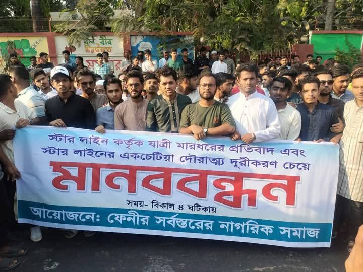 স্টার লাইন কর্তৃক যাত্রীকে মারধোর এর প্রতিবাদে ও বিকল্প ফেনী টু ঢাকা যানবাহন চালুর দাবিতে মানববন্ধন করেছেন ফেনীর সবস্তরের নাগরিক সমাজ।