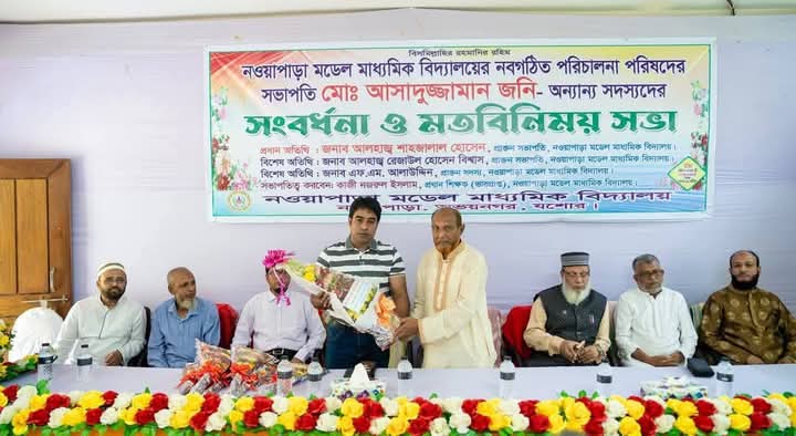 সাংবাদিক বি এম শামসুর রহমান (জসিম):- ঐতিহ্যবাহি বিদ্যাপিঠ নওয়াপাড়া মডেল মাধ্যমিক বিদ্যালয়ের নবগঠিত এডহক কমিটির সভাপতি আসাদুজ্জামান জনি ও অন্যান্য সদস্যদের সংবর্ধনা প্রদান করা হয়েছে। অন্যান্য সদস্যরা হলেন সদস্য সচিব বিদ্যালয়ের ভারপ্রাপ্ত প্রধান শিক্ষক কাজী নজরুল ইসলাম, অভিভাবক সদস্য নুর মোহাম্মদ সরদার, শিক্ষক প্রতিনিধি মোঃ হেদায়েত হোসেন।মঙ্গলবার ( ৮ মার্চ) বেলা ১২ ঘটিকায় বিদ্যালয়ের হলরুমে সংবর্ধনা প্রদান অনুষ্ঠানটি অনুষ্ঠিত হয়। সংবর্ধনা প্রদান অনুষ্ঠানে নবনির্বাচিত সভাপতি আসাদুজ্জামান জনি সহ সকলকে ফুলেল শুভেচ্ছা জানানো হয়। এসময় প্রধান অতিথি হিসাবে উপস্থিত ছিলেন বিদ্যালয়ের প্রাক্তন সভাপতি বিশিষ্ট ব্যবসায়ী ও সমাজসেবক আলহাজ্ব শাহজালাল হোসেন, বিশেষ অতিথি হিসাবে উপস্থিত ছিলেন বিদ্যালয়ের সাবেক সভাপতি বিশিষ্ট ব্যবসায়ী ও সমাজসেবক আলহাজ্ব রেজাউল হোসেন বিশ্বাস, প্রাক্তন সদস্য এফ এম আলাউদ্দিন বিশিষ্ট ব্যবসায়ী ও সমাজ সেবক কামরুজ্জামান মজুমদার। এছাড়াও সংবর্ধনা অনুষ্ঠানে উপস্থিত ছিলেন নওয়াপাড়া প্রেসক্লাবের সাধারণ সম্পাদক মফিজুর রহমান দপ্তরী, দৈনিক প্রভাত ফেরির নির্বাহী সম্পাদক হারুণ - অর- রশিদ, অভয়নগর প্রেসক্লাবের সভাপতি সৈয়দ রিপন, সাধারণ সম্পাদক আশরাফুল ইসলাম মাসুম সহ বিদ্যালয়ের শিক্ষক শিক্ষিকা, অভিভাবক, সুধীজনসহ অন্যান্যরা।